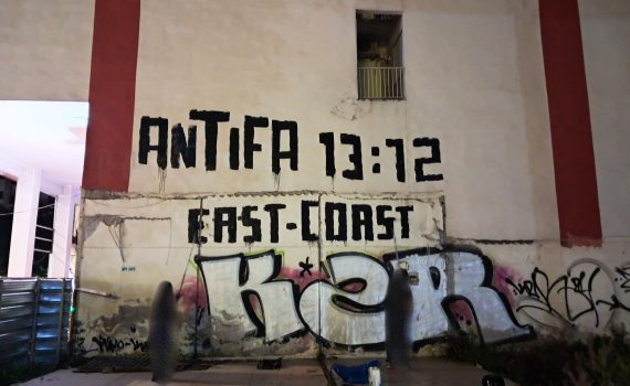 Antifa: δηλαδή μια λέξη-κλειδί, γνώριμη στην πολυεθνική εργατική τάξη, που σιχαίνεται τους φασίστες, το ελληνικό κράτος και τους μηχανισμούς του. Η αναγκαία μορφή οργάνωσης μας σε εποχές που ο κρατικός φασισμός (με ή χωρίς σβάστικα) καλπάζει. Η μάχη για τις γειτονιές μας, από πλατεία σε πλατεία, κι από τοίχο σε τοίχο.