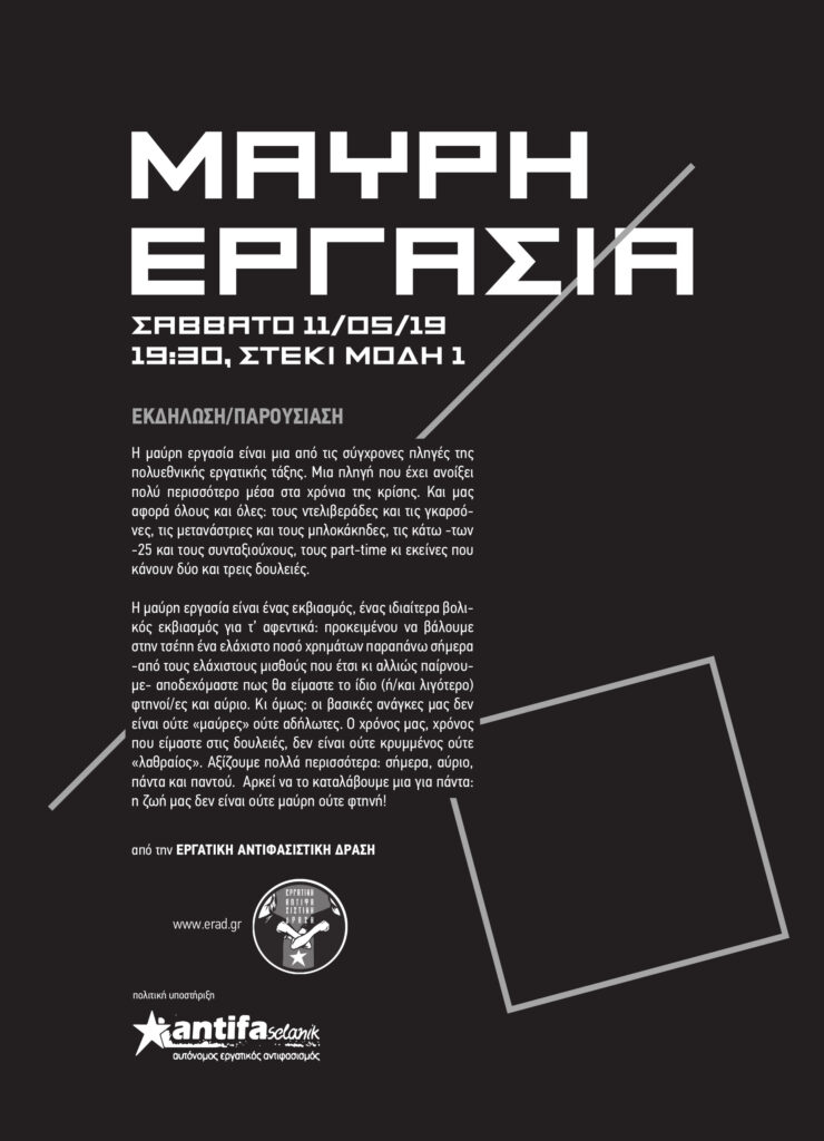 Η μαύρη εργασία είναι μια από τις σύγχρονες πληγές της πολυεθνικής εργατικής τάξης. Μια πληγή που έχει ανοίξει πολύ περισσότερο μέσα στα χρόνια της κρίσης. Και μας αφορά όλους και όλες: τους ντελιβεράδες και τις γκαρσόνες, τις μετανάστριες και τους μπλοκάκηδες, τις κάτω-των-25 και τους συνταξιούχους, τους part-time κι εκείνες που κάνουν δύο και τρεις δουλειές. Η μαύρη εργασία είναι ένας εκβιασμός, ένας ιδιαίτερα βολικός εκβιασμός για τ’ αφεντικά: προκειμένου να βάλουμε στην τσέπη ένα ελάχιστο ποσό χρημάτων παραπάνω σήμερα –από τους ελάχιστους μισθούς που έτσι κι αλλιώς παίρνουμε- αποδεχόμαστε πως θα είμαστε το ίδιο (ή/και λιγότερο) φτηνοί/ες και αύριο. Κι όμως: οι βασικές ανάγκες μας δεν είναι ούτε «μαύρες» ούτε αδήλωτες. Ο χρόνος μας, χρόνος που είμαστε στις δουλειές, δεν είναι ούτε κρυμμένος ούτε «λαθραίος». Αξίζουμε πολλά περισσότερα: σήμερα, αύριο, πάντα και παντού. Αρκεί να το καταλάβουμε μια για πάντα: η ζωή μας δεν είναι ούτε μαύρη ούτε φτηνή!