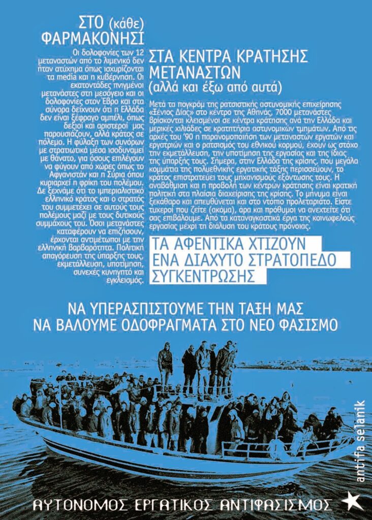 Μετά τα πογκρόμ της ρατσιστικής αστυνομικής επιχείρησης “Ξένιος Δίας” στο κέντρο της Αθήνας, 7000 μετανάστες βρίσκονται κλεισμένοι σε κέντρα κράτησης ανά την Ελλάδα και μερικές χιλιάδες σε κρατητήρια αστυνομικών τμημάτων. Από τις αρχές του ’90 η παρανομοποίηση των μεταναστών εργατών και εργατριών και ο ρατσισμός του εθνικού κορμού, έχουν ως στόχο την εκμετάλλευση, την υποτίμηση της εργασίας και της ίδιας της ύπαρξης τους. Σήμερα, στην Ελλάδα της κρίσης, που μεγάλα κομμάτια της πολυεθνικής εργατικής τάξης περισσεύουν, το κράτος επιστρατεύι τους μηχανισμούς εξόντωσης τους. Η αναβάθμιση και η προβολή των κέντρων κράτησης είναι κρατική πολιτική στα πλαίσια διαχείρισης της κρίσης. Το μήνυμα είναι ξεκάθαρο και απευθύνεται και στο ντόπιο προλεταριάτο. Είστε τυχεροί που ζείτε (ακόμα), άρα και πρόθυμοι να ανεχτείτε ότι σας επιβάλλουμε. Από τα καταναγκαστικά έργα της κοινοφελούς εργασίας μέχρι τη διάλυση του κράτους πρόνοιας.