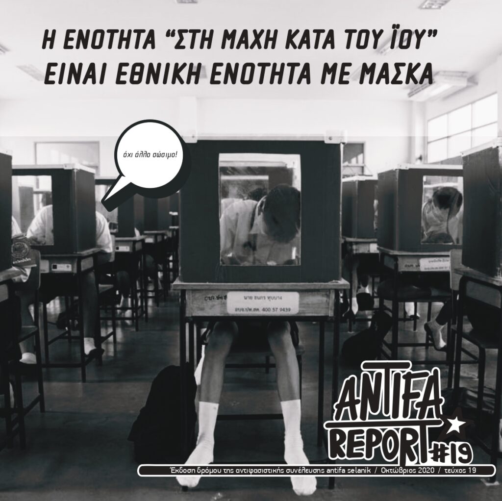 Το έντυπο δρόμου antifa report #19 τυπώθηκε τον Οκτώβριο του 2020, σε 2.000 αντίτυπα. Μοιράζεται σε σχολεία της θεσσαλονίκης και χέρι με χέρι από τη συνέλευση antifa selanik. Κυκλοφορεί σε στέκια, καταλήψεις και antifa συναυλίες. Αν δεν το πετύχεις σε κάποιο από τα παραπάνω μέρη, στείλε μας ένα mail στο antifasln@yahoo.gr.