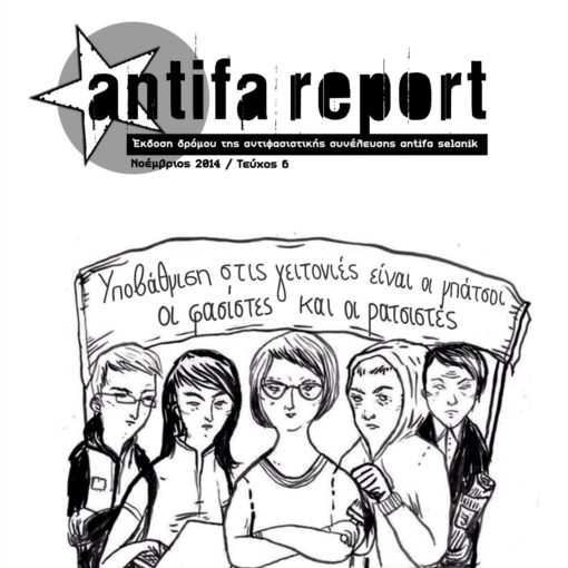 Το έντυπο δρόμου antifa report #08 τυπώθηκε τον Μάιο του 2015, σε 2.000 αντίτυπα. Μοιράζεται σε σχολεία της θεσσαλονίκης και χέρι με χέρι από τη συνέλευση antifa selanik. Κυκλοφορεί σε στέκια, καταλήψεις και antifa συναυλίες. Αν δεν το πετύχεις σε κάποιο από τα παραπάνω μέρη, στείλε μας ένα mail στο antifasln@yahoo.gr.