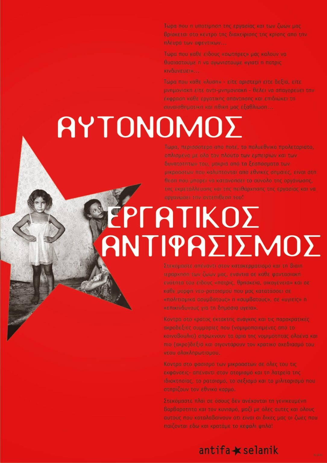 Κόντρα στο φασισμό των μικροαστών σε όλες του τις εκφάνσεις – απέναντι στον ατομισμό και τη λατρεία της ιδιοκτησίας, το ρατσισμό, το σεξισμό και το μιλιταρισό που στηρίζουν τον εθνικό κορμό.