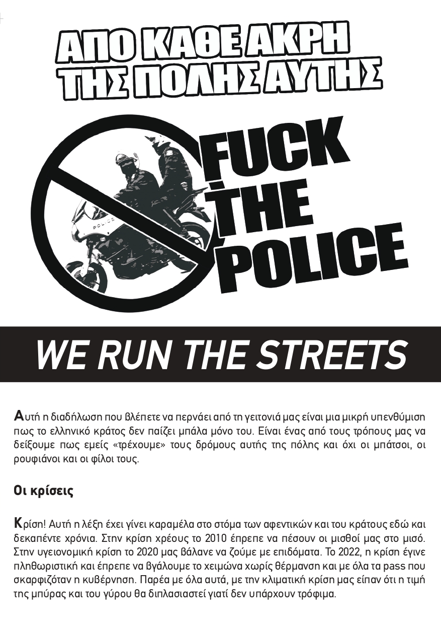 Αυτή η διαδήλωση που βλέπετε να περνάει από τη γειτονιά μας είναι μια μικρή υπενθύμιση πως το ελληνικό κράτος δεν παίζει μπάλα μόνο του. Είναι ένας από τους τρόπους μας να δείξουμε πως εμείς «τρέχουμε» τους δρόμους αυτής της πόλης και όχι οι μπάτσοι, οι ρουφιάνοι και οι φίλοι τους.
