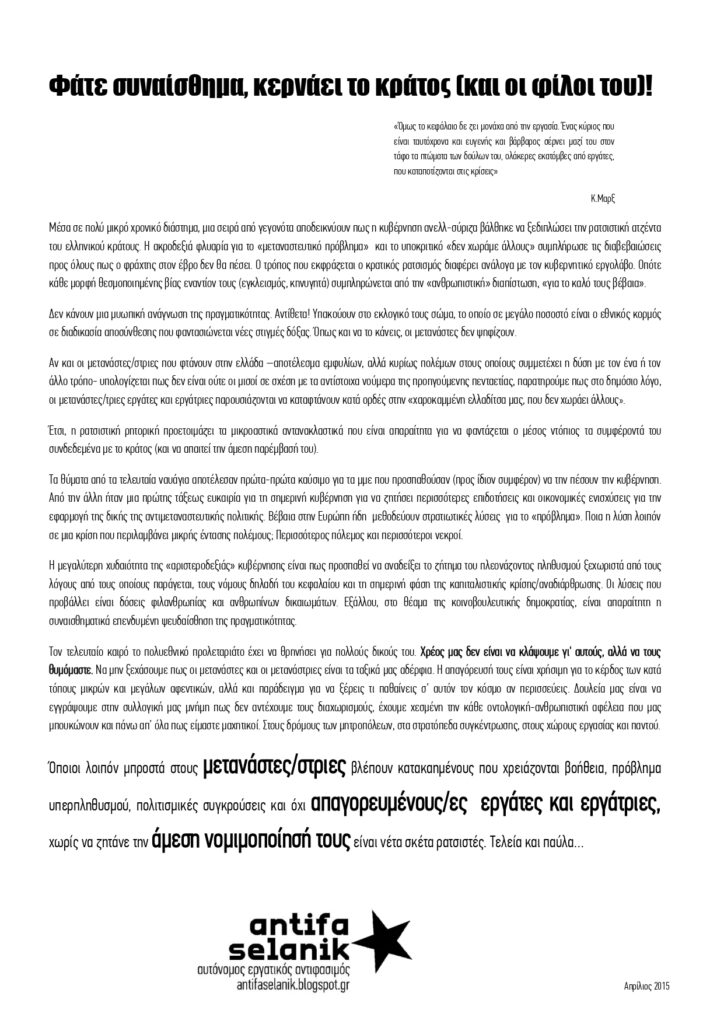 Μέσα σε πολύ μικρό χρονικό διάστημα, μια σειρά από γεγονότα αποδεικνύουν πως η κυβέρνηση ανελλ-σύριζα βάλθηκε να ξεδιπλώσει την ρατσιστική ατζέντα του ελληνικού κράτους. Η ακροδεξιά φλυαρία για το «μεταναστευτικό πρόβλημα» και το υποκριτικό «δεν χωράμε άλλους» συμπλήρωσε τις διαβεβαιώσεις προς όλους πως ο φράχτης στον έβρο δεν θα πέσει. Ο τρόπος που εκφράζεται ο κρατικός ρατσισμός διαφέρει ανάλογα με τον κυβερνητικό εργολάβο. Οπότε κάθε μορφή θεσμοποιημένης βίας εναντίον τους (εγκλεισμός, κηνυγητά) συμπληρώνεται από την «ανθρωπιστική» διαπίστωση, «για το καλό τους βέβαια».