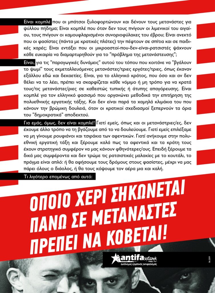 Για εμάς, όμως, δεν είναι κομπλέ! Γιατί εμείς, όπως και οι μετανάστριες/ες, δεν έχουμε άλλο τρόπο να τη βγάζουμε από το να δουλεύουμε. Γιατί εμείς επιλέξαμε να μη γίνουμε ρουφιάνοι και τσιράκια των αφεντικών. Γιατί ανήκουμε στην πολυεθνική εργατική τάξη και ξέρουμε καλά πως τα αφεντικά και τα κράτη τους έχουν στρατηγικό συμφέρον να μας κάνουν φθηνότερες/ους. Επειδή ξέρουμε τα δικά μας συμφέροντα και δεν τρώμε τις ρατσιστικές μαλακίες με το κουτάλι, το πράγμα είναι απλό: ή θα αφήσουμε τους δρόμους στους φασίστες, μέχρι να μας πάρει όλους ο διάολος, ή θα τους κόψουμε τον αέρα μια και καλή.