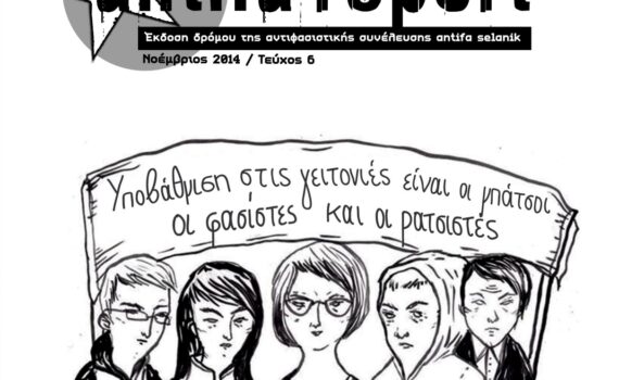Antifa: δηλαδή μια λέξη-κλειδί, γνώριμη στην πολυεθνική εργατική τάξη, που σιχαίνεται τους φασίστες, το ελληνικό κράτος και τους μηχανισμούς του. Η αναγκαία μορφή οργάνωσης μας σε εποχές που ο κρατικός φασισμός (με ή χωρίς σβάστικα) καλπάζει. Η μάχη για τις γειτονιές μας, από πλατεία σε πλατεία, κι από τοίχο σε τοίχο.