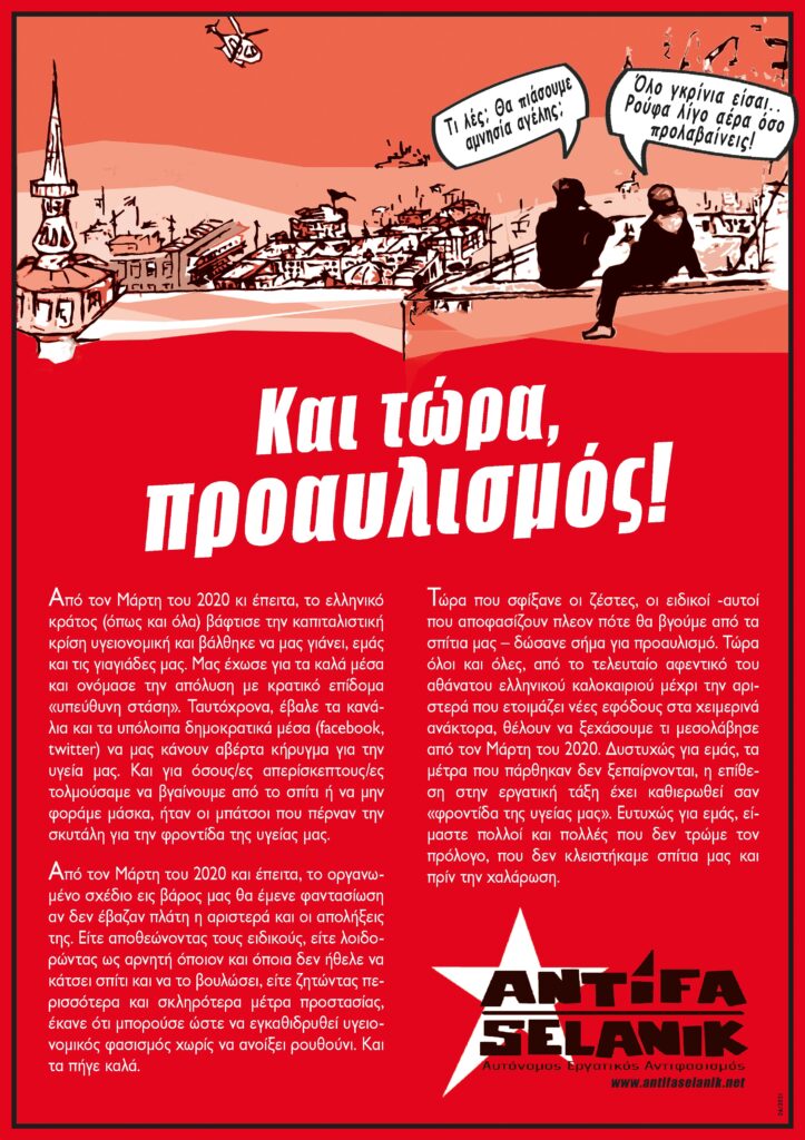 Τώρα που σφίξανε οι ζέστες, οι ειδικοί -αυτοί που αποφασίζουν πλέον πότε θα βγούμε από τα σπίτια μας – δώσανε σήμα για προαυλισμό. Τώρα όλοι και όλες, από το τελευταίο αφεντικό του αθάνατου ελληνικού καλοκαιριού μέχρι την αριστερά που ετοιμάζει νέες εφόδους στα χειμερινά ανάκτορα, θέλουν να ξεχάσουμε τι μεσολάβησε από τον Μάρτη του 2020. Δυστυχώς για εμάς, τα μέτρα που πάρθηκαν δεν ξεπαίρνονται, η επίθεση στην εργατική τάξη έχει καθιερωθεί σαν «φροντίδα της υγείας μας». Ευτυχώς για εμάς, είμαστε πολλοί και πολλές που δεν τρώμε τον πρόλογο, που δεν κλειστήκαμε σπίτια μας και πριν την χαλάρωση.