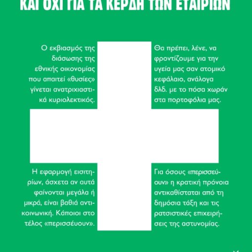 – ”Όλα αυτά τα οικονομικά μέτρα” αντιμετώπισης του ιού έγιναν τώρα κυριολεκτικά μέτρα προστασίας της ανταγωνιστικότητας της εθνικής οικονομίας. Σήμερα, το επιδοτούμενο κλείσιμο επιχειρήσεων για τον ιό έχει γίνει επιδότηση για τα λειτουργικά έξοδα των αφεντικών, ώστε να προστατευθούν από τον διεθνή ανταγωνισμό. Όλα αυτά τα λεφτά για τα ελληνικά αφεντικά, βγαίνουν από τα κρατικά ταμεία που είναι μείον εδώ και δυο χρόνια. Μαντεψτε ποιοι και ποιες θα κληθούν να πληρώσουν την επόμενη κρίση χρέους…